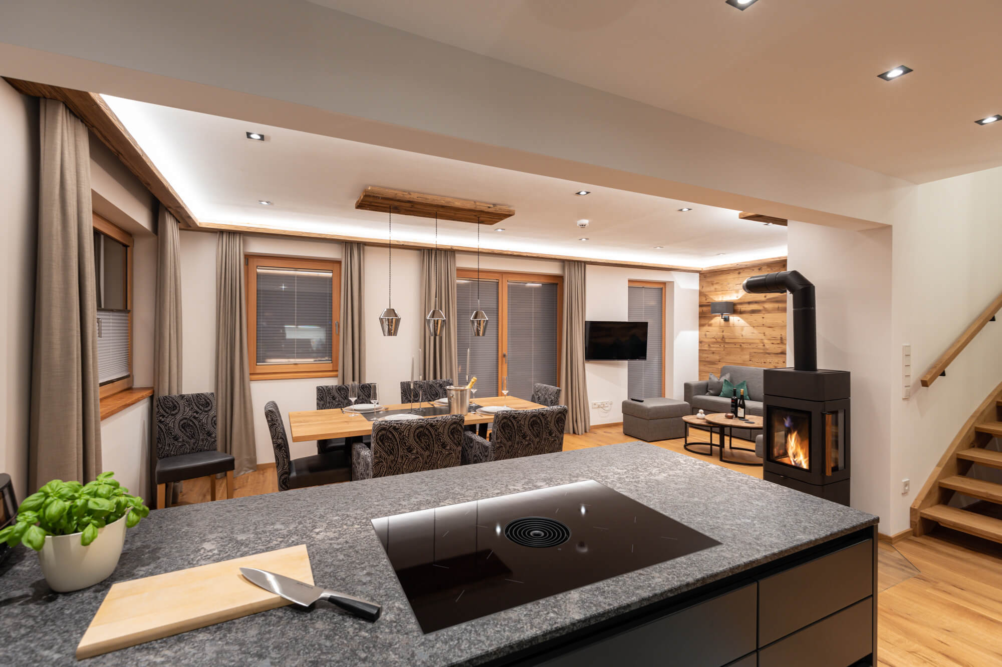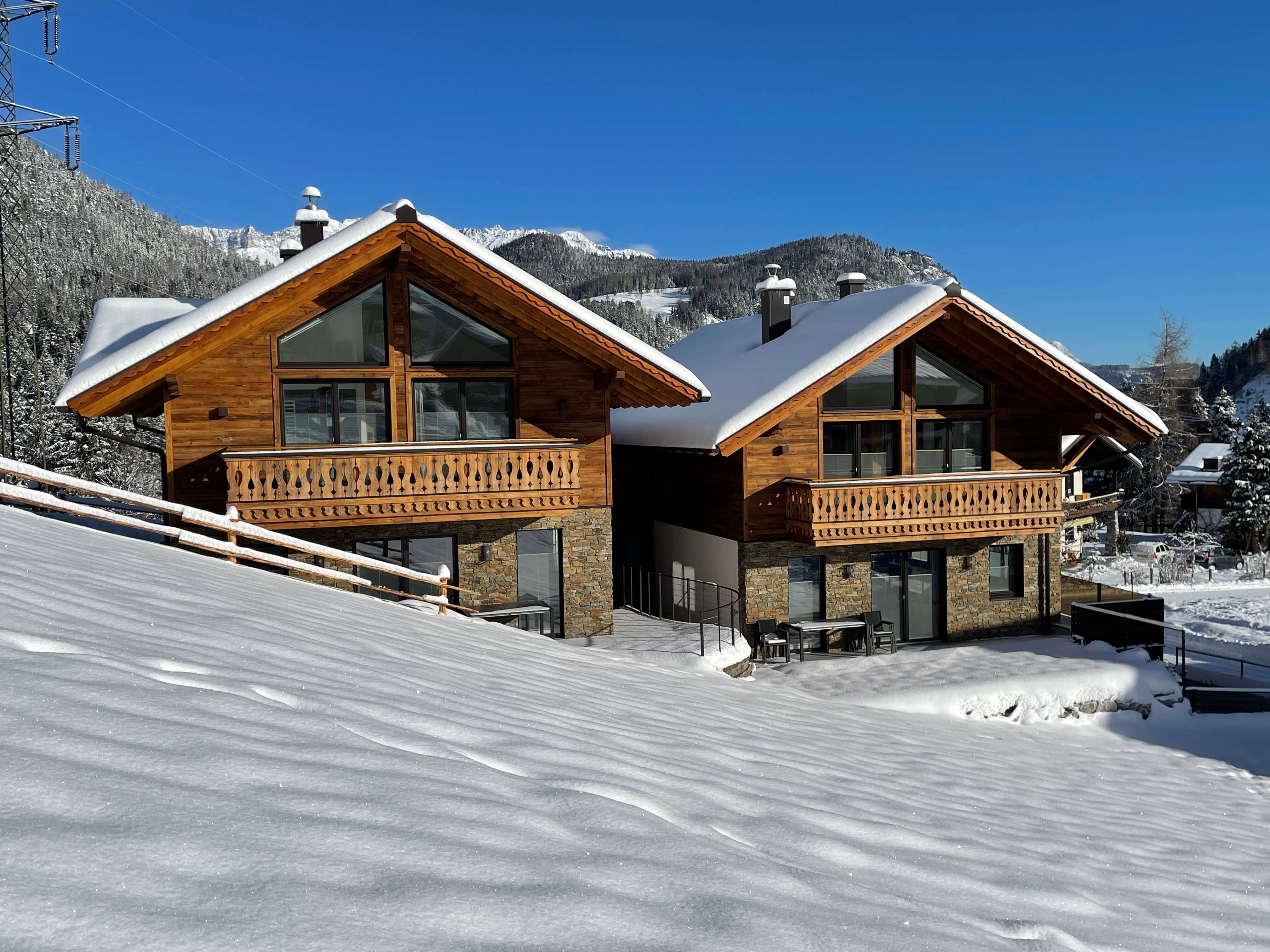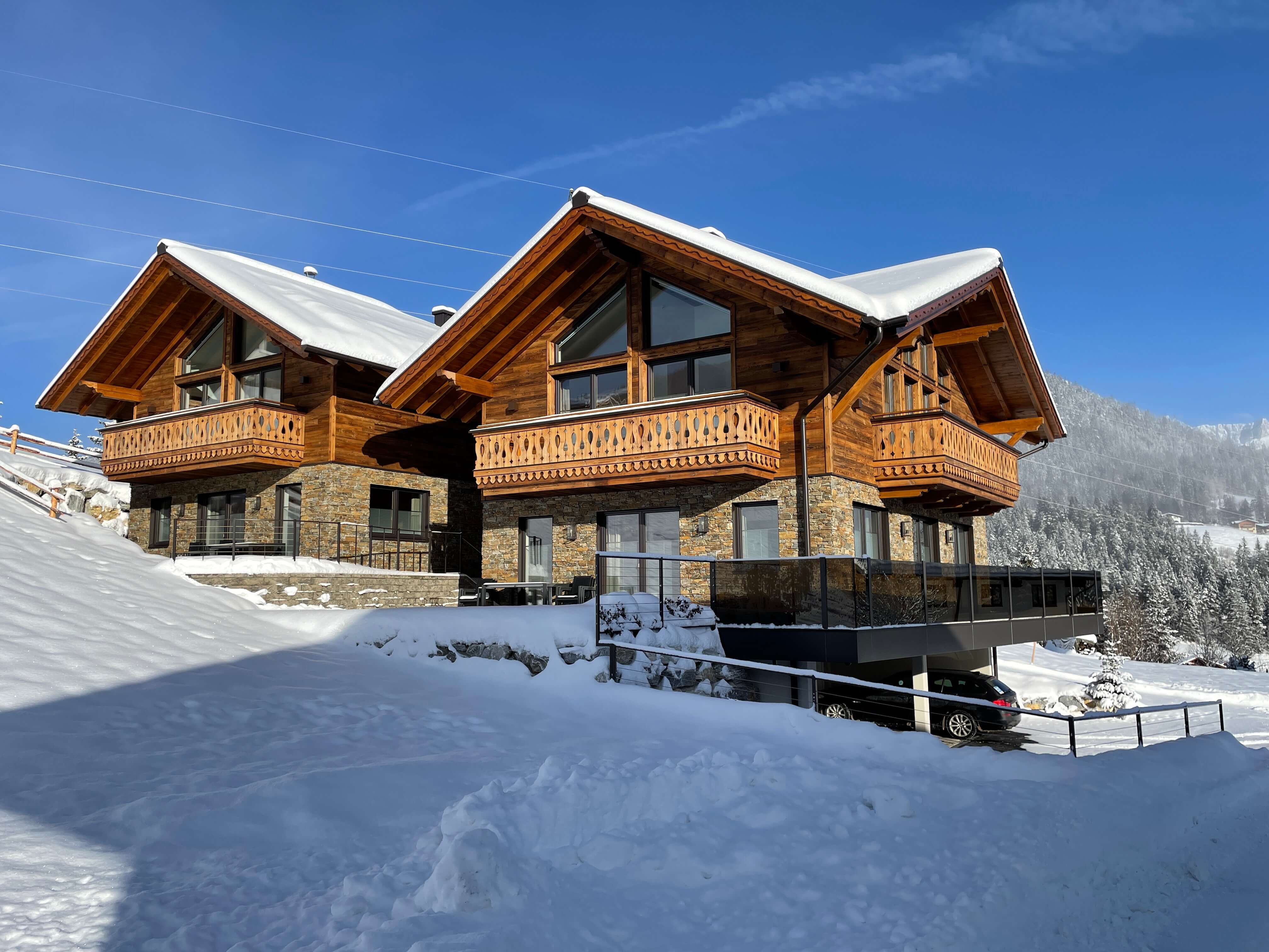 Die 2020 neu erbauten Ferienhäuser mit Panoramablick zeigen sich im alpinen Design und wurden mit feinster Holzarbeit, kombiniert mit Stein und Glas ausgestattet und sorgen damit für ein absolut stimmiges Gesamtkonzept.
