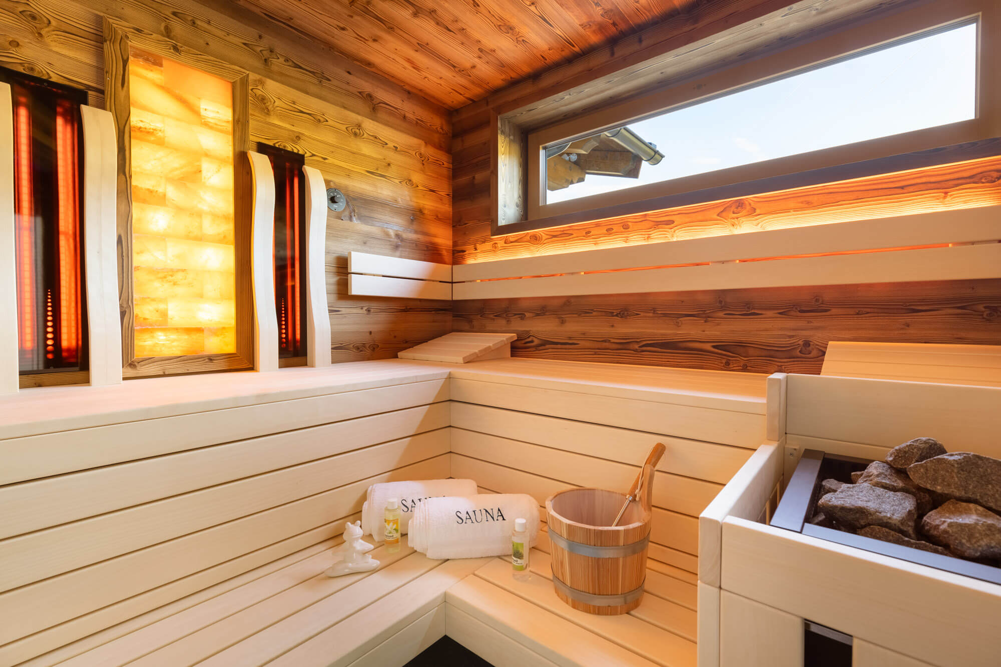 Nach dem Abenteuer in den Bergen erwartet sie ein gemütliches, Hüttenfeeling de luxe mit eigenem Wellnessbereich.